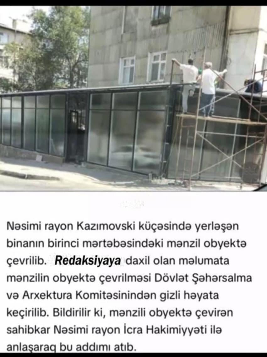 Paytaxtın Nəsimi rayonunda aparılan qanunsuz tikinti səkinin zəbt edilməsinə səbəb olub. Normativ tikinti qaydalarına zidd olaraq binanın zirzəmisi qazılaraq həmin yerdə qanunsuz tikinti işlərinin aparılmasına Nəsimi rayon İcra Hakimiyyəti gizli anlaşmaya vararaq hadisəyə göz yummaqla kifayətləndiyi bildirilir.NOCOMMENT.az xəbər verir ki, Nəsimi rayonunda növbəti qanunsuz tikinti hadisəsi Mirmahmud Kazımovski küçəsindəki iki mərtəbəli qanunsuz obyektin tikintisinə icazə verilməsidir.